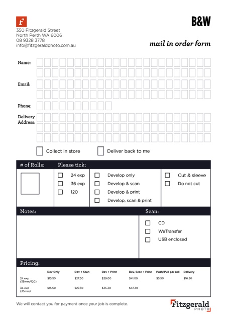 If you live far away or want to mail in your film for processing and/or scanning, please print and fill out one of our film mail in order forms and include it in your parcel!